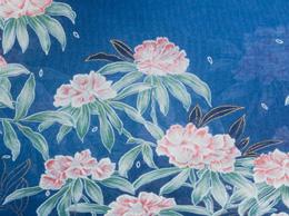 シャクナゲをモチーフに、藍のやさしい色合いで染め上げたハンカチ。旅の思い出に、ぜひどうぞ。